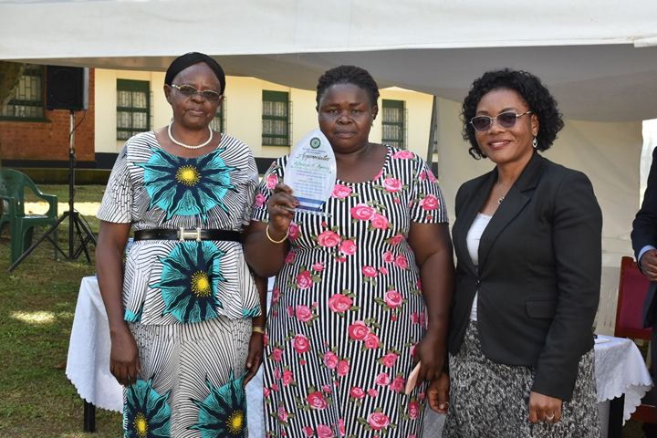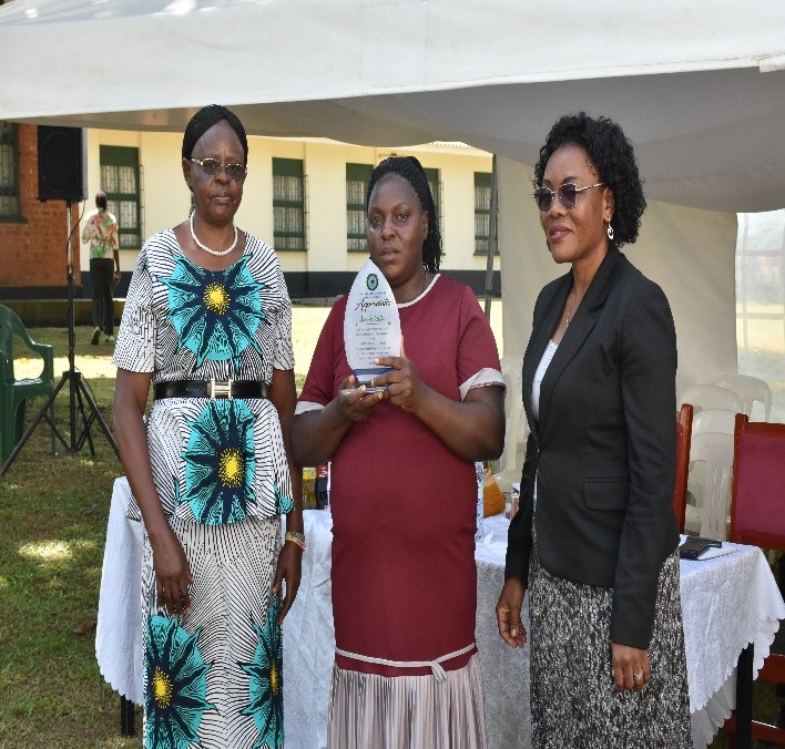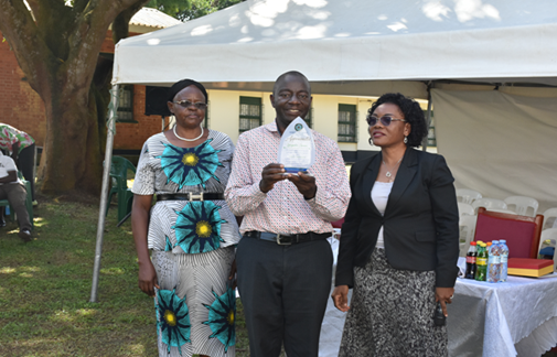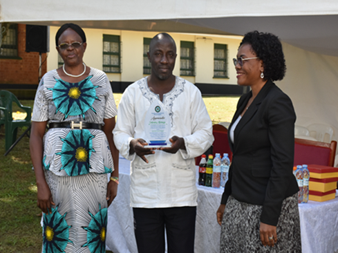 Dr. Juliet Nakku (Right), the hospital Director awarding the outstanding staff members during the meeting